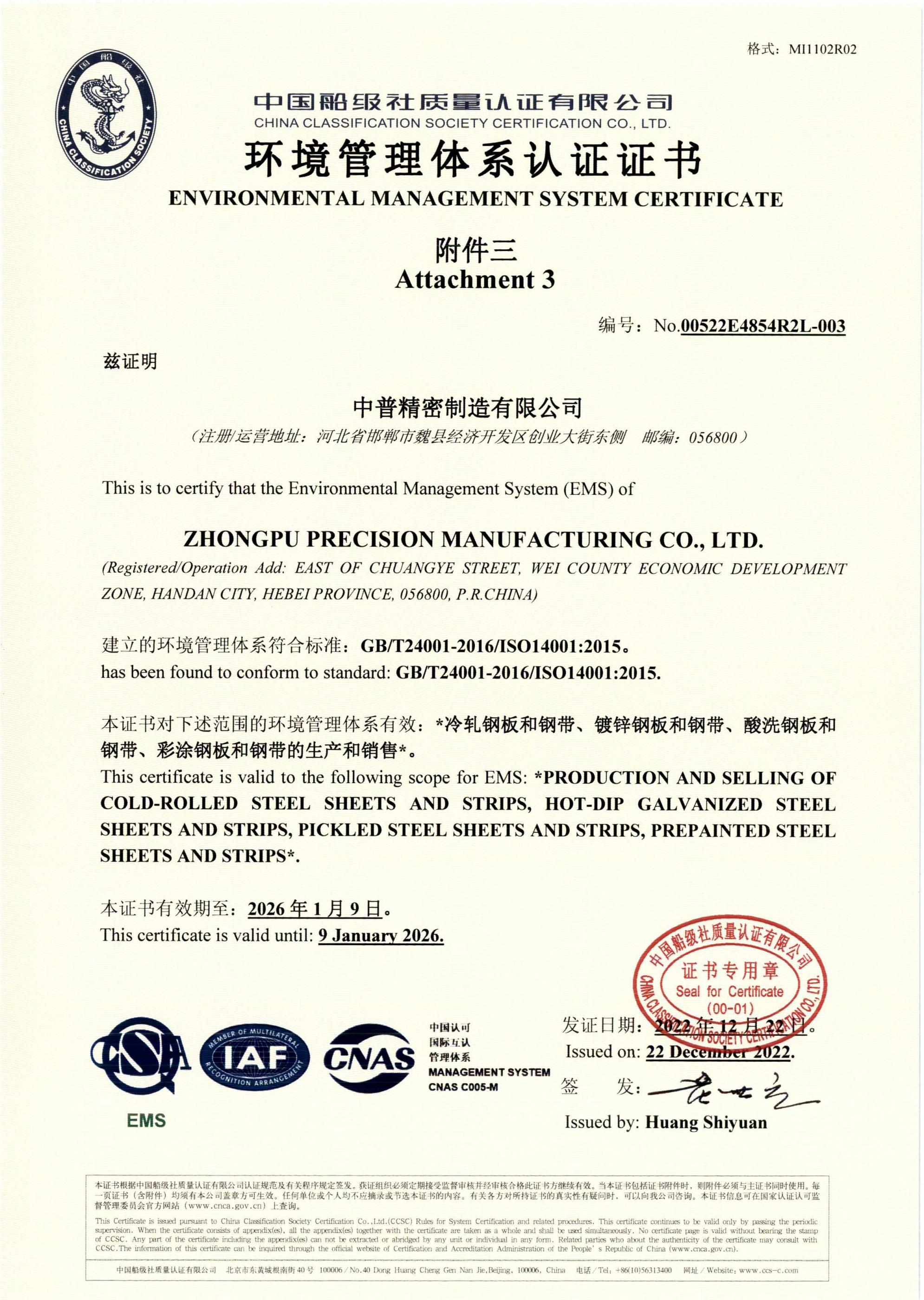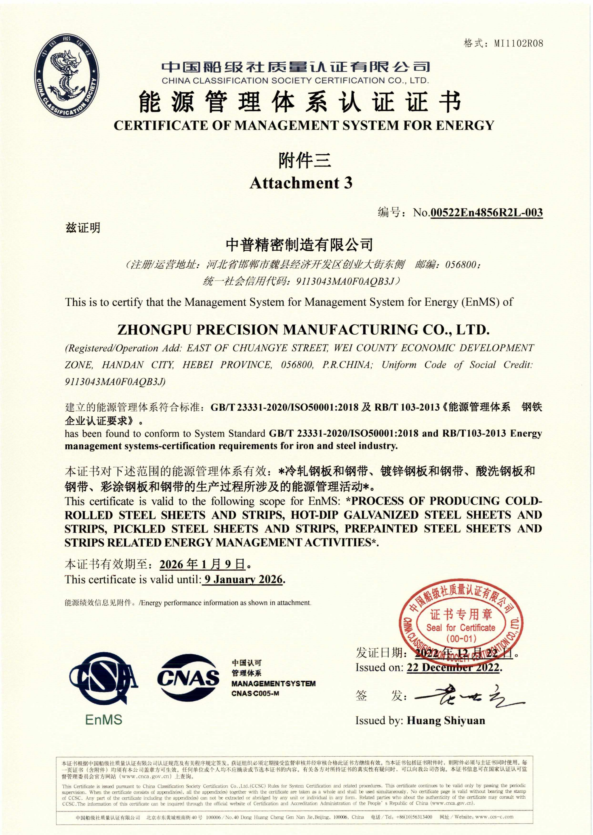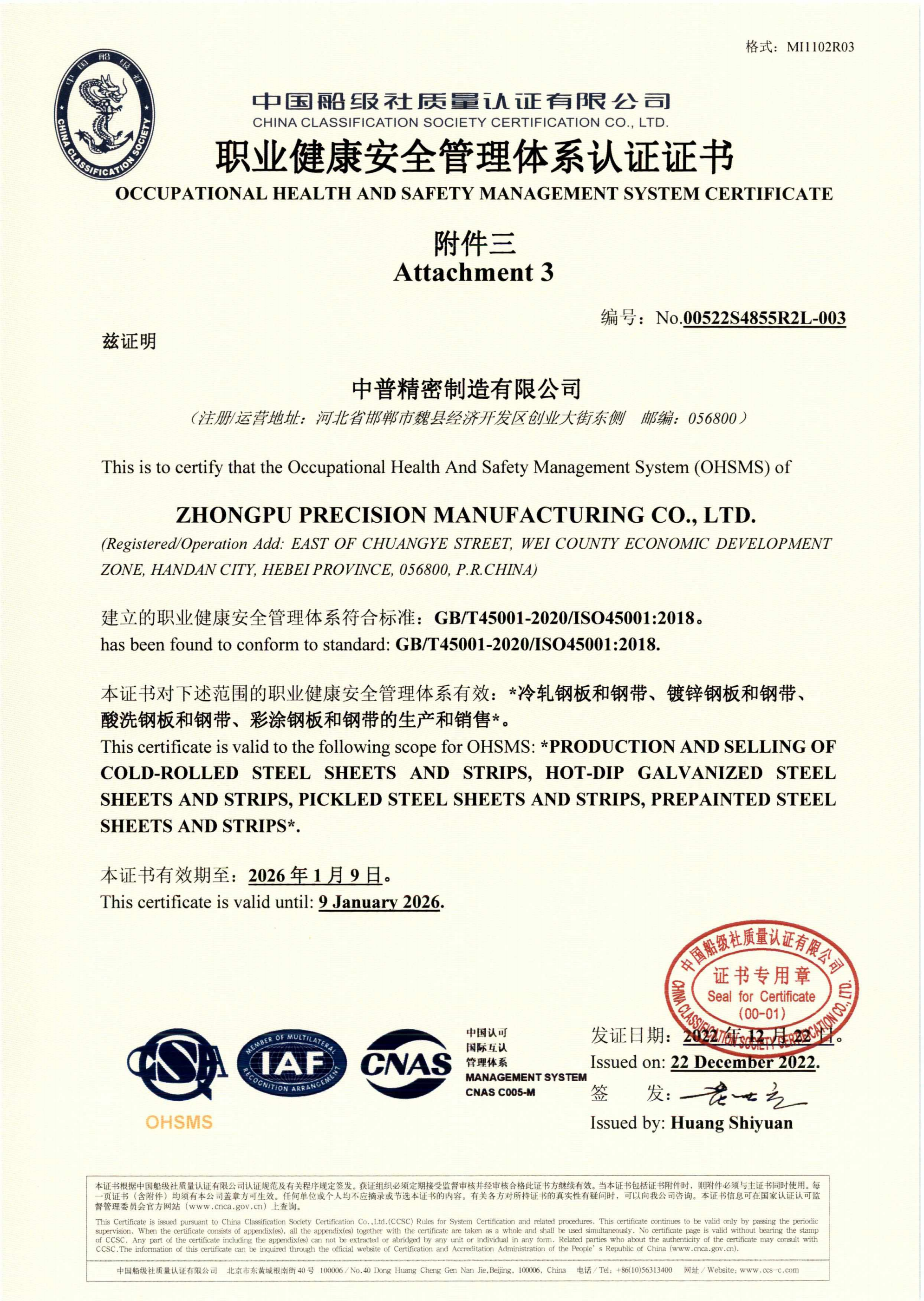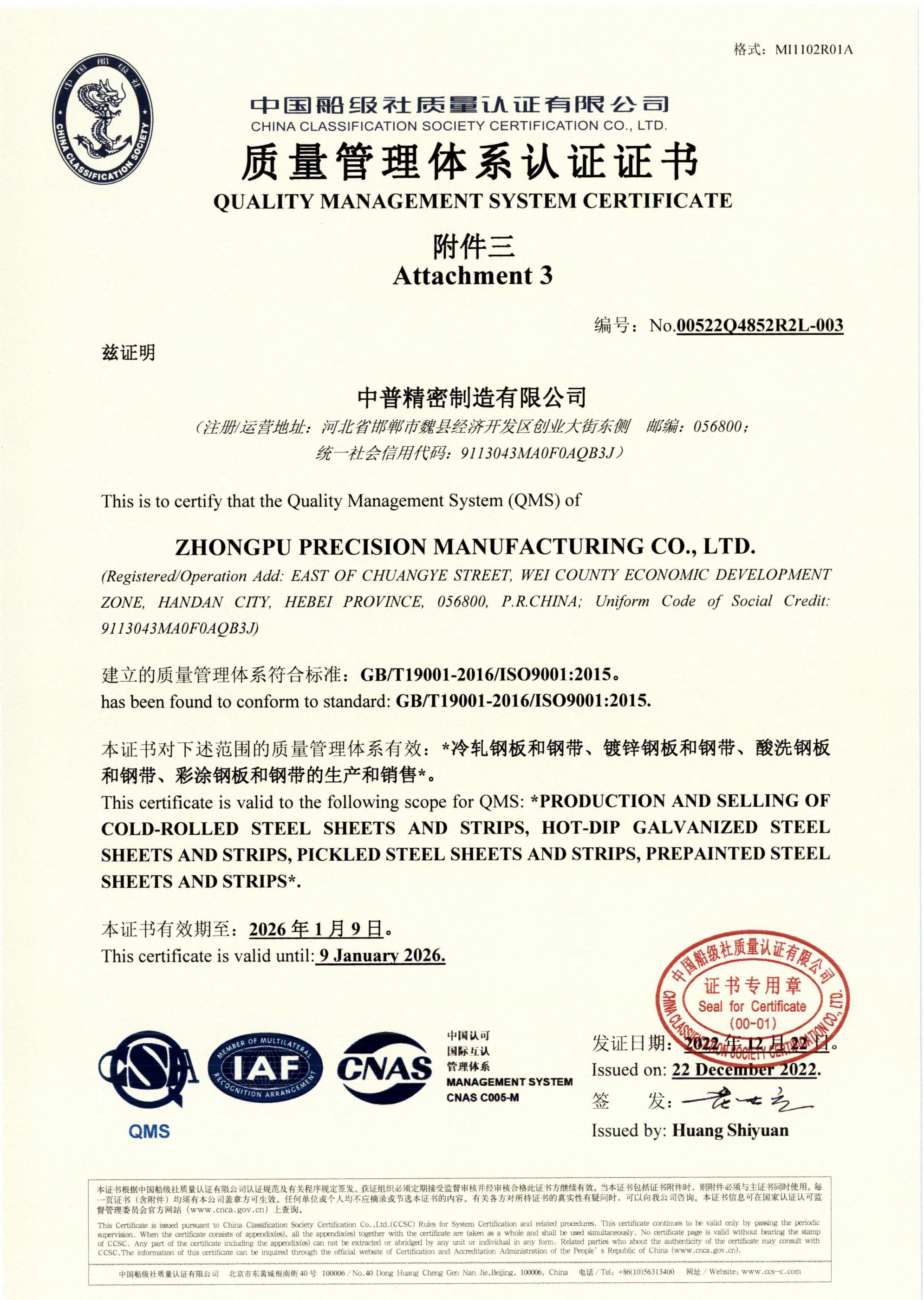 中普精密制造有限公司(以下简称公司)成立于2020年5月,位于河北省邯郸市魏县经济开发区创业大街东侧,是“河北普阳钢铁有限公司”在魏县设立的全资子公司,总投资20亿元,占地面积500亩。 中普精密制造有限公司一期建设有1条推拉式酸洗机组年产量120万吨,4台单机架六辊可逆冷轧机组年产量100万吨,1条镀“锌铝镁”机组年产量45万吨,2条镀“铝锌硅”机组年产量40万吨、2条彩涂机组年产量30万吨,并配以相应的公辅设施、研发与检测设备。公司配备全套的德国西门子公司电控系统、德国EMG 公司对中系统与英国ABB 公司张力仪等先进配套设备。 公司主要产品为酸洗卷板、冷硬卷板、镀锌卷板、冷轧卷板、镀铝锌卷板、彩涂卷板、镀锌铝美卷板等 …